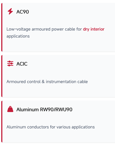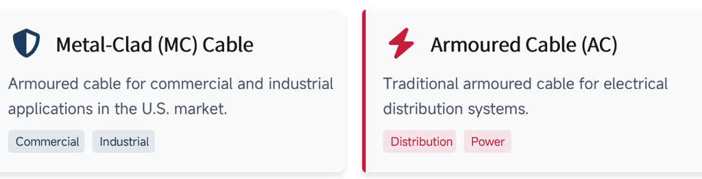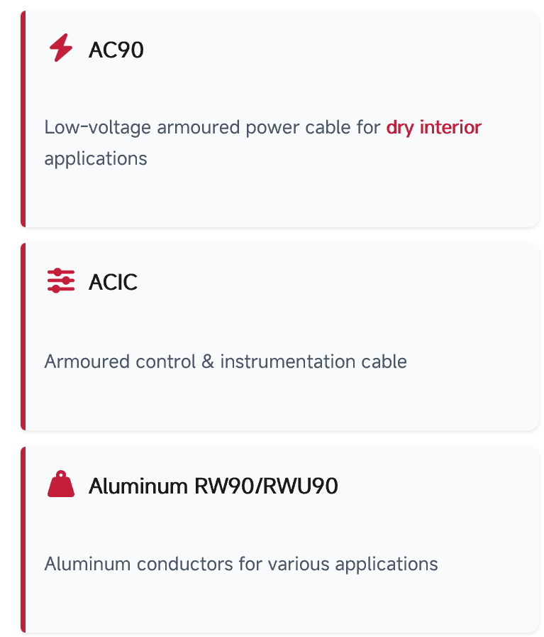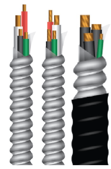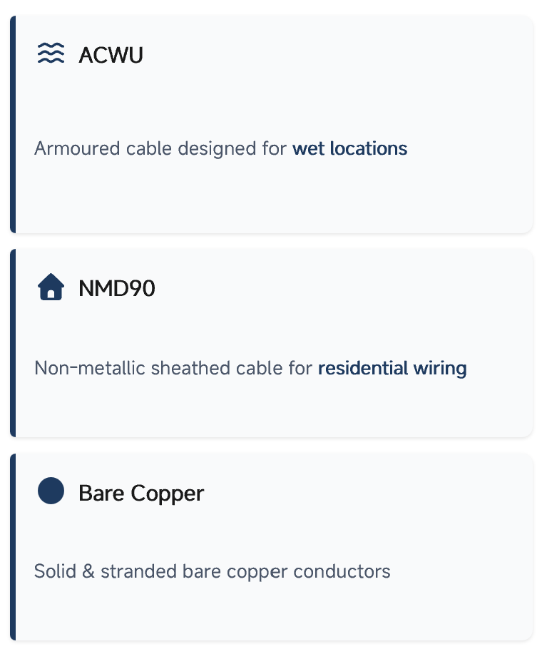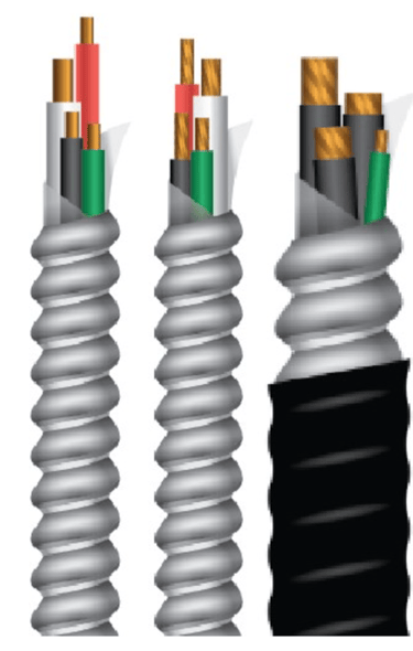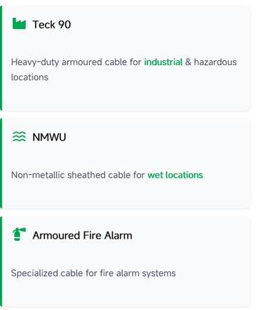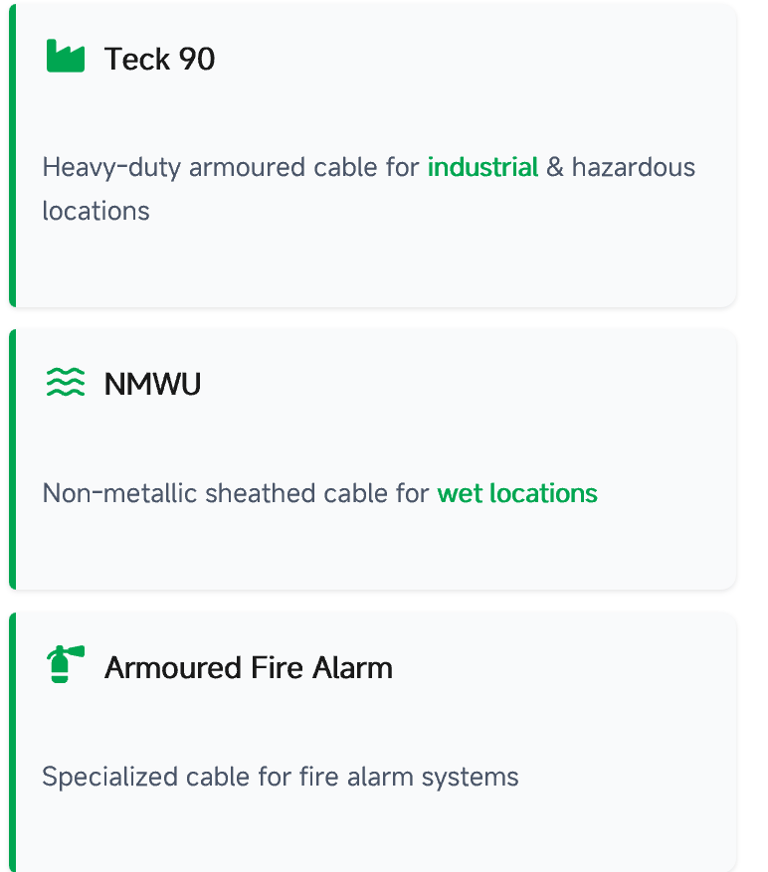 Armoured cable types such as TECK90, AC90, and ACWU for power distribution, underground or wet locations, and hazardous-rated circuits.