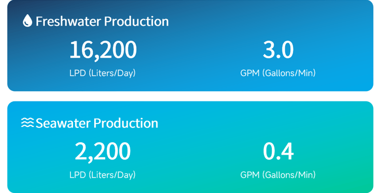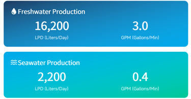 High output capacity, producing up to 21,800 liters per day from freshwater sources